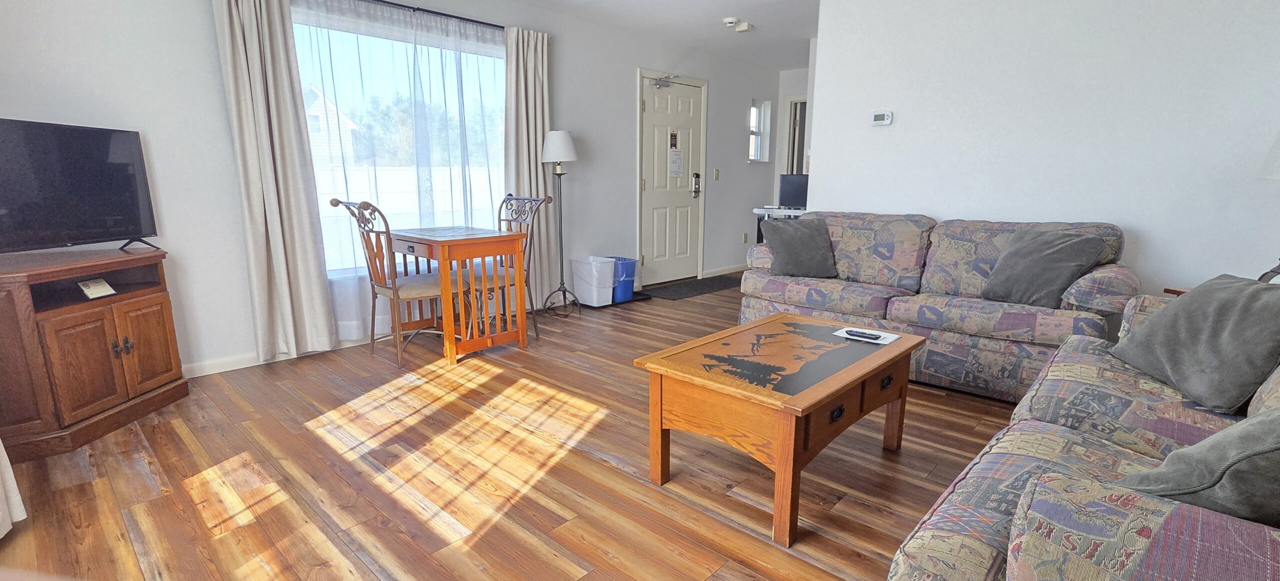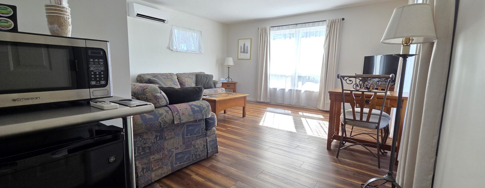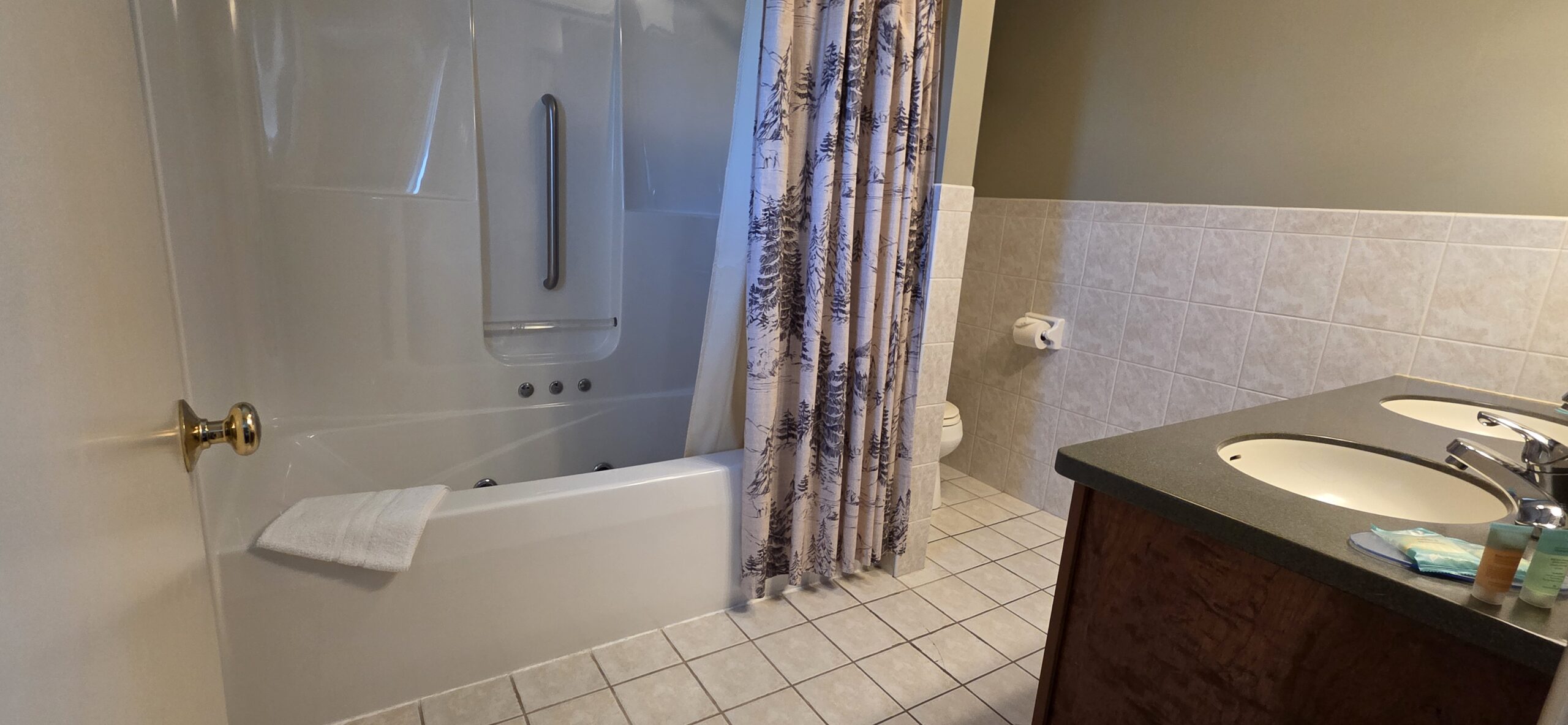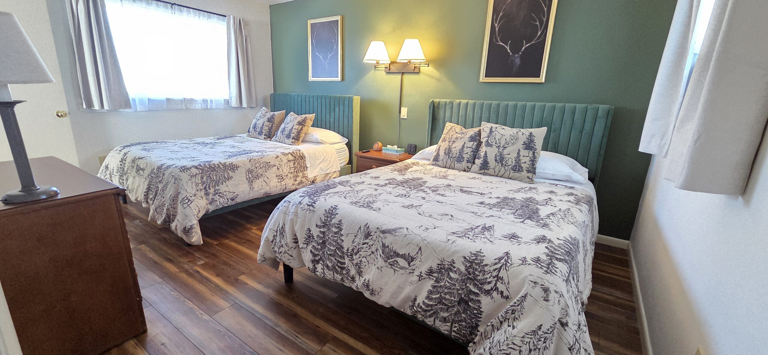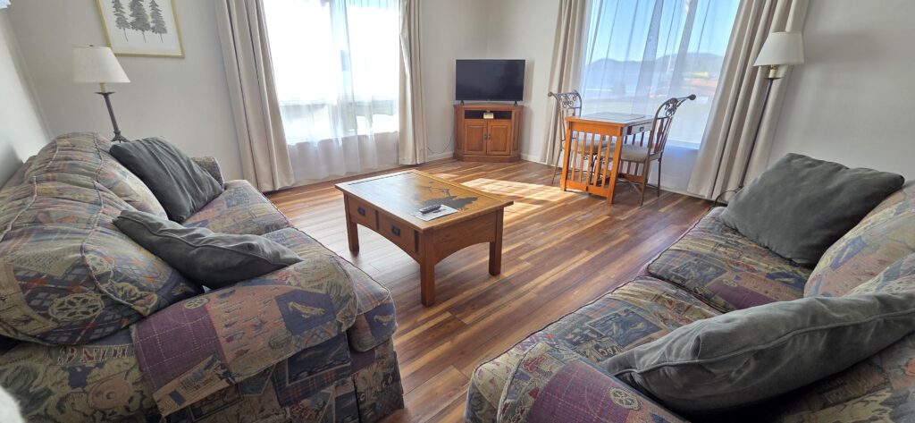 The newly renovated Grand Lodge Suite, our largest accommodation, offers a separate bedroom with two queen beds, an oversize bathroom with whirlpool bath, and a window adorned living room with dramatic lake views hosting two sleeper sofas to allow space for our larger groups.